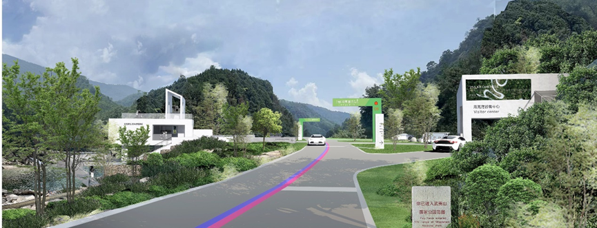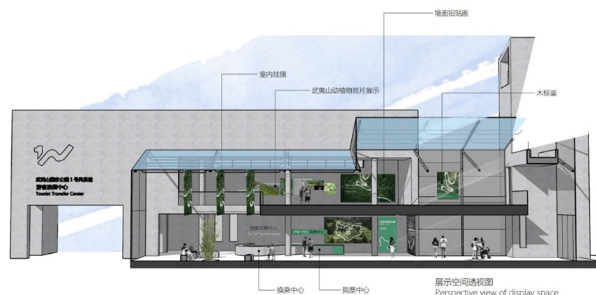 驿站选址于武夷山国家公园1号风景道的重要节点,承担着游客中心和观景台的双重功能,因此需具有一定的可识别性和鲜明的视觉形象。“与自然共生”的理念主要体现在顺应地形地貌和缩小建筑体量方面,驿站通过灵活设置观景平台、线性建筑布局来顺应现有坡地地形,同时行人采用地面过街方式,以降低建筑对自然环境的整体影响。