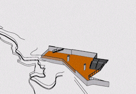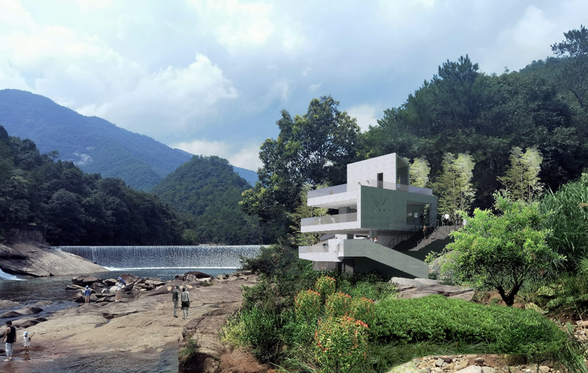这是一组由若干个小型体量组成的建筑聚落,驿站分为游客中心与观景台两个主要分区。其中,游客中心部分的体量呼应周边的山势,以流动的线性关系组合;观景台部分的体量则临水选址,以观景视线为引导灵动错落组合。建筑群落关系收放有致,与自然环境实现了较好的融合。设计选用了清水混凝土为主要建筑材料,可以实现较好的耐候性与耐久性,符合风景区的使用需求,可以较大程度减少日后运营维护成本。