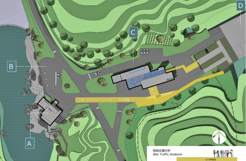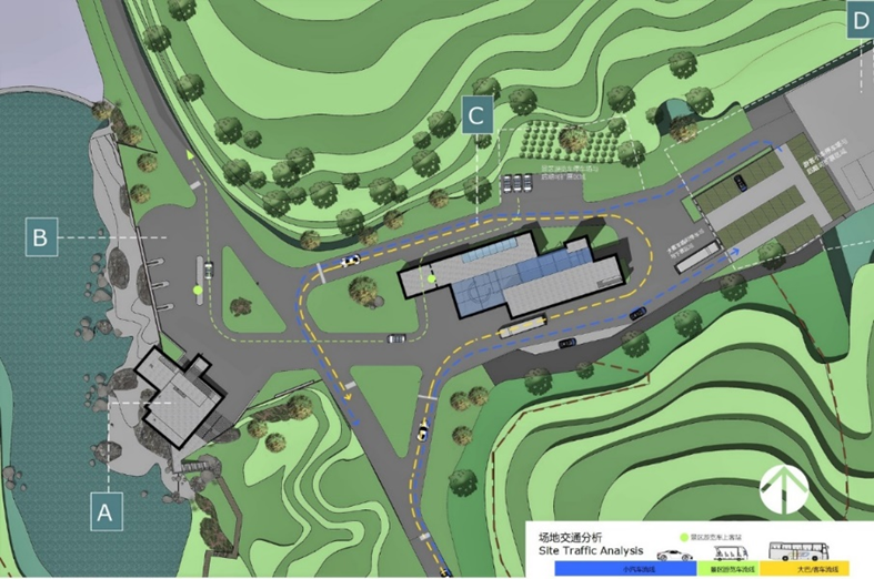 在交通组织设计方面,方案中巧妙设置了4块分流草坪,选择适合的人流穿行方式,设计与景区标识一体化的交通信号灯,用经济实用、简单易行的方法引导人车分流,保障了行人安全,同时尽量不影响现有生态环境。