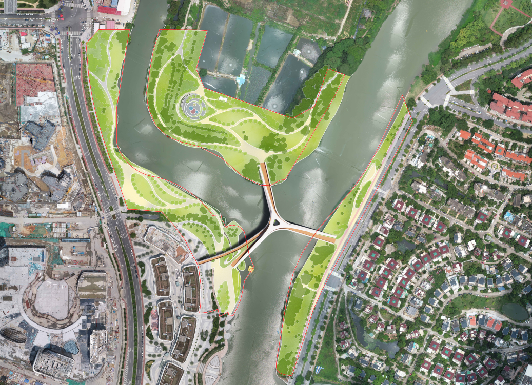 设计结合结构互承的基本原理,以最短距离连接三岸,满足通行需求;对应岭南炎热气候环境设置遮阴顶棚,桥体坦拱与顶棚对角相连,构筑跃动曲线。三肢交汇中心为了减少结构荷载,开设连通天空、河水与行人的洞口,形成具有吸引力的城市公共空间。