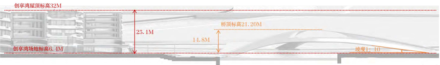 为了与周边多层建筑的协调,并保持区域建筑与景观之间的和谐,需要合理控制桥梁的建筑高度;为了保证步行的舒适性,桥体坡道应相对平缓,不宜过高。