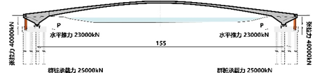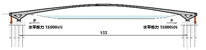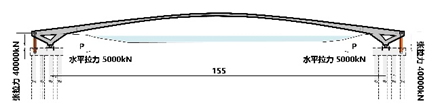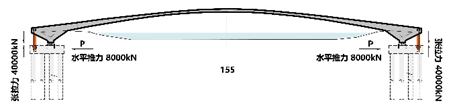 综合上述限制,桥面中心的高程仅能控制在14.8m,使得桥梁的矢高仅有8.4m。拱桥的每肢长度86m,其受力模式与长度172m、矢高8.4m的平面拱结构类似,计算得出的矢跨比为1/20。