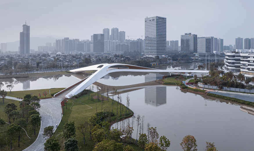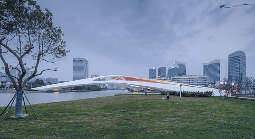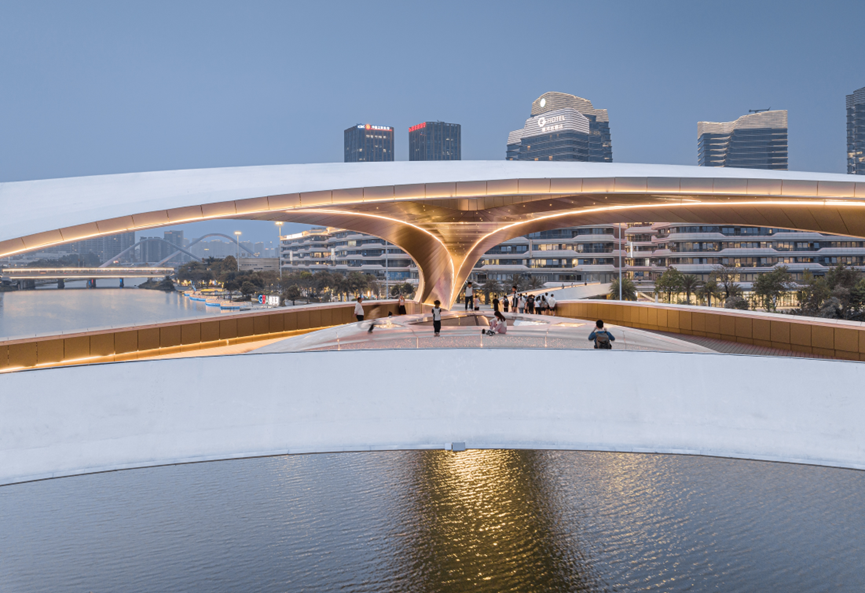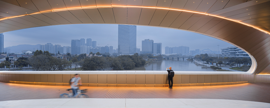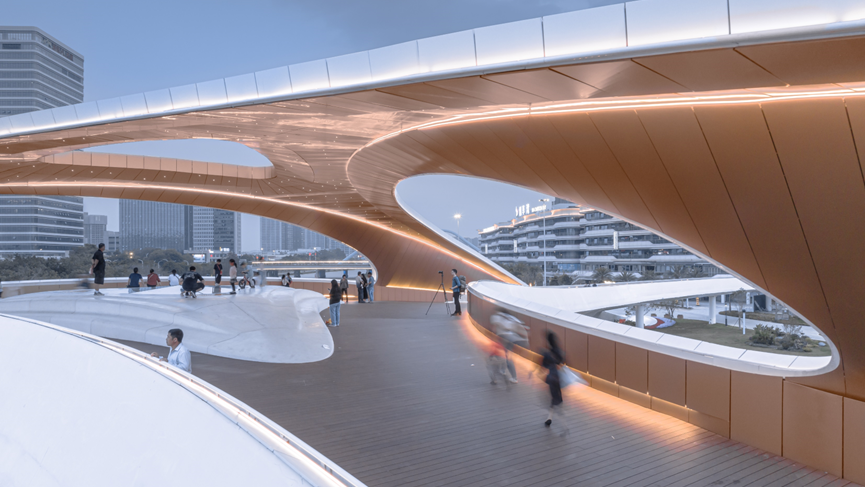 当游人远距离观览时,纯净洁白而优美的桥身呈现出未来感和雕塑感;当游人近距离游览时,遮荫避雨的雨棚、暖调钛锌金属幕墙的桥体内侧空间,以及舒适的扶手、竹木地板和休憩座椅,均体现出具有温度的人本情怀。