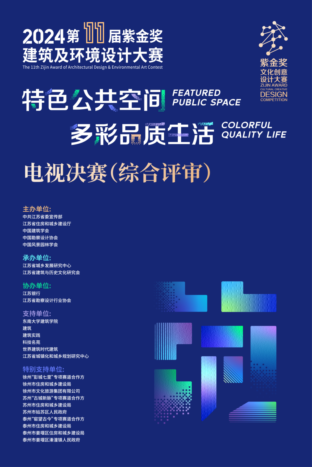 由中共江苏省委宣传部、江苏省住房和城乡建设厅联合中国建筑学会、中国勘察设计协会、中国风景园林学会共同举办的第十一届“紫金奖·建筑及环境设计大赛”,经作品征集、专业评审和社会公示,共有18项优秀作品奖一等奖入围电视决赛。决赛将于2025年1月6日在江苏省广播电视总台教育频道举办。具体日程安排如下: