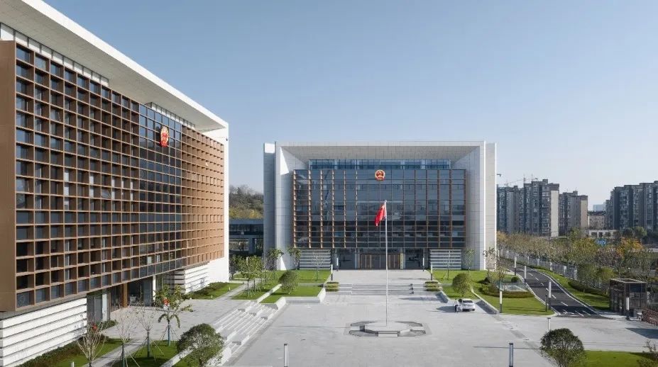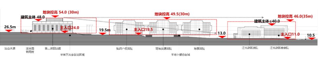 园区场地临近老山,北高南低,高差约15米。设计利用场地原始高差,逐层抬升,彰显了法制秩序。采用绝对标高与相对标高相结合,通过精细化的地块高度管控引导建设。建筑设计中通过地块基准高坪设计、半地下平台设计、各建筑体量高度设计等一系列操作解决了复杂流线(公众、法官、羁押等)的分流管理,实现多功能立体交叠。