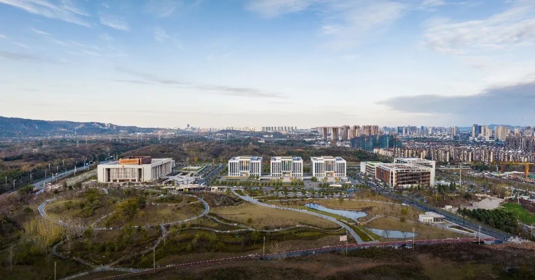 泸州市市民中心项目基于对场地内山体生态景观的保护,采用建筑与自然山体的共构策略。主体建筑以台地姿态呈现,与自然山体穿插互动。