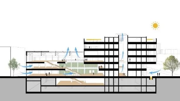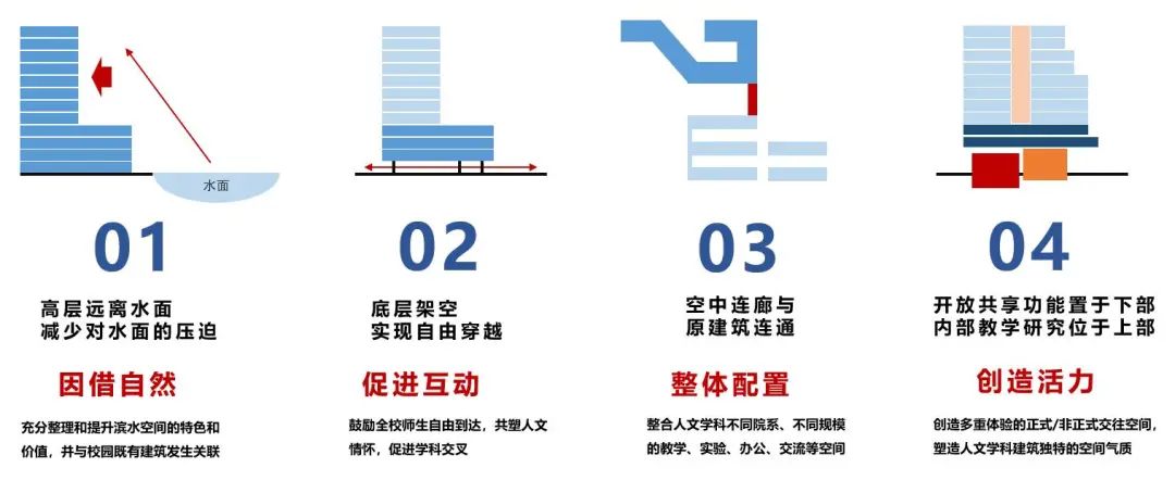 底层进行架空处理,实现人流的自由穿越、自由到达,提供多处室内外交往空间,促进学科交叉。餐饮咖啡、公共教学、公共会议等功能位于建筑一至四层,系科教学研究功能位于建筑上部,创造出多重体验的非正式交往空间,塑造了人文空间气质。