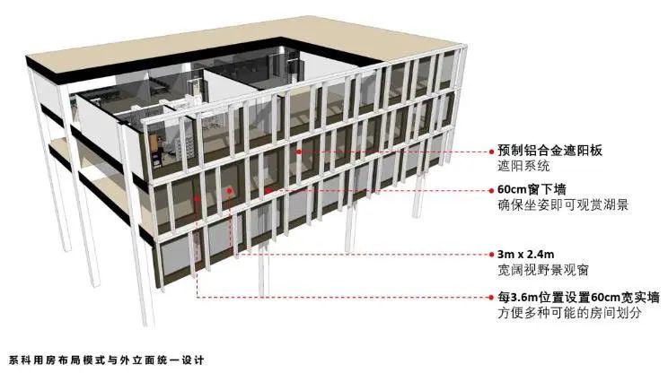 设计采用“因借自然、促进互动、创造活力”的一体化设计策略,将高层部分远离湖面布局,并向湖面逐级降低,减少对水面的压迫感。