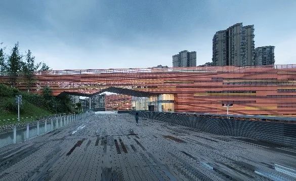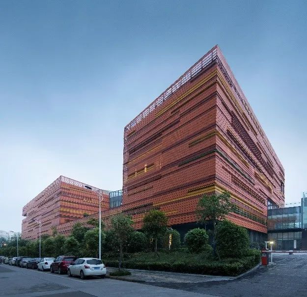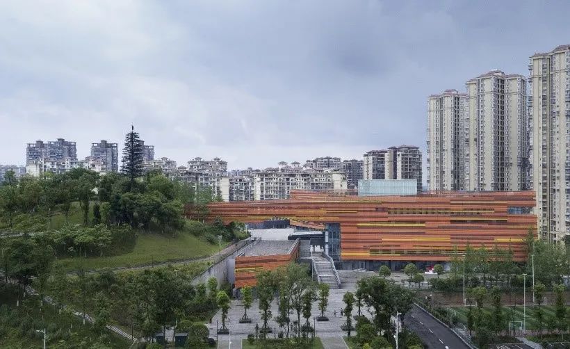 建筑色彩取泸州酒窖五色土的意涵,利用彩色铝制格栅统一建筑形体,体现了泸州甘醇浓烈的文化气质,形成了与泸州人豪放性格相得益彰的地域景观特色。