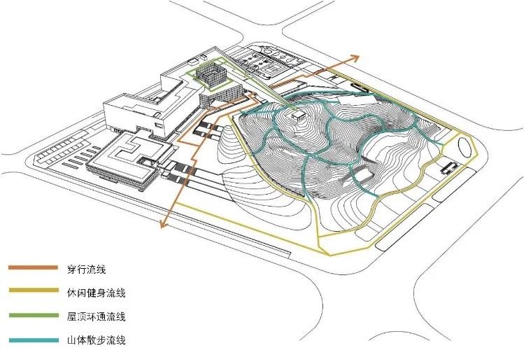 建筑空间、形体布局与地形地貌有机结合,在获得最大化的公共活动场地的同时,建筑与山体、人工与自然彼此依存,和谐共生,创建了以立体化步行流线为纽带、室内外彼此渗透、各功能区互为补充的文化活动场所。