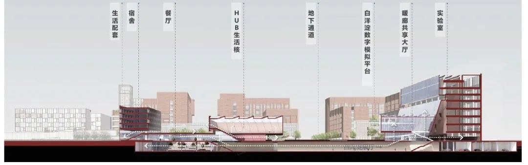 设计对城市规划进行调整,建构整体层级化路网体系,中部设礼仪轴线,串联广场和地面上下院落群,使用人群步行贯穿各地块建筑,免受机动车交通干扰。同时为了适应寒冷地区气候条件,主体建筑设置地下贯通、空中联系的暖廊系统,结合南向主厅及东向侧厅,冬季形成温室,夏季利用底层可开启界面进行拔风。