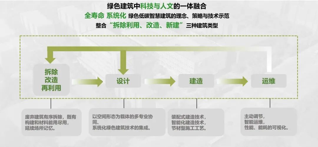 设计提出并验证了以空间形态为核心的多专业协同、系统化绿色建筑技术的集成方法,探索了减碳固碳目标导向下老建筑构件、材料适应性再利用的技术路径,研创了“绿色生态捕捉界面”,实现了高能效装配式建筑外界面的技术集成。项目构建了绿色设计产品供应平台,并形成了系统的技术集成体系。