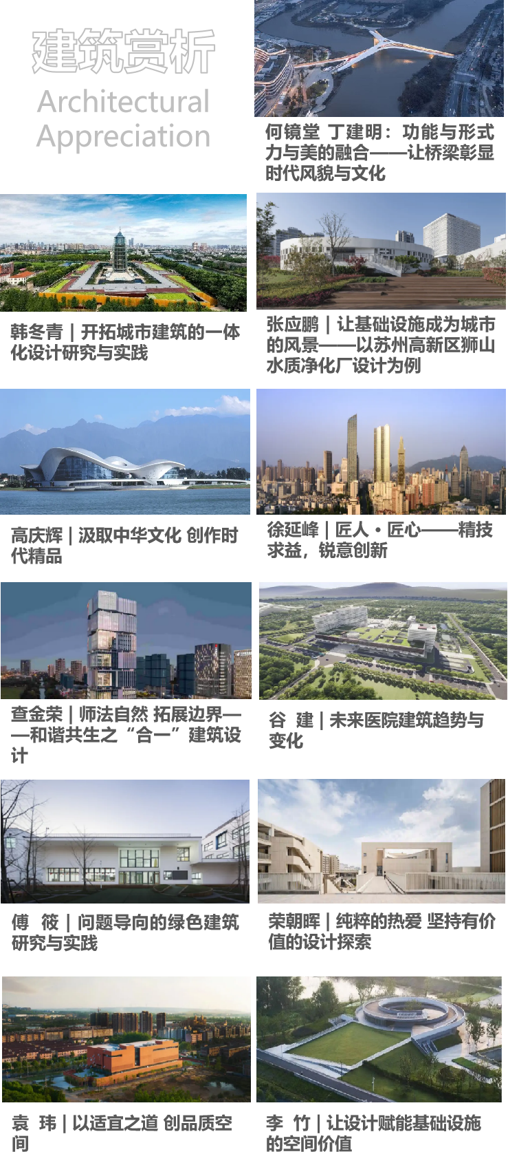 设立“建筑赏析”专栏,持续推送优秀建筑作品鉴赏,期待栏目成为行业和社会各界鉴赏优秀作品、分享设计理念和促进专业交流的平台,成为社会了解优秀作品、优秀设计师的窗口。年度共推送设计师及代表作品共11篇,涵盖建筑、设施等多类优秀设计作品。
