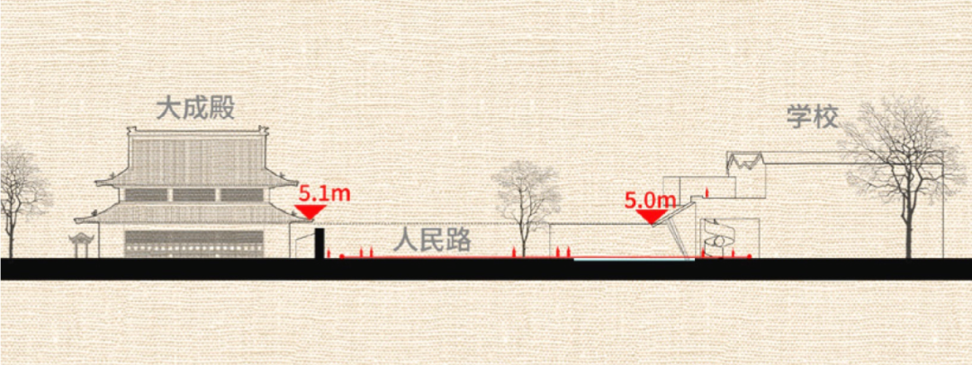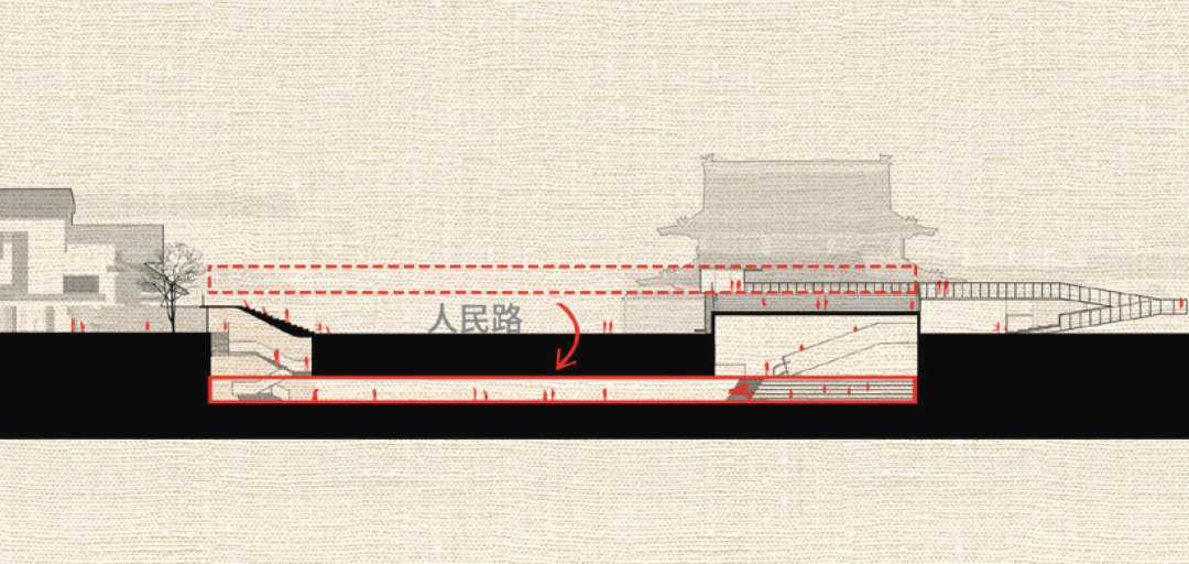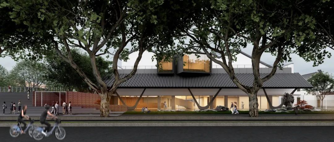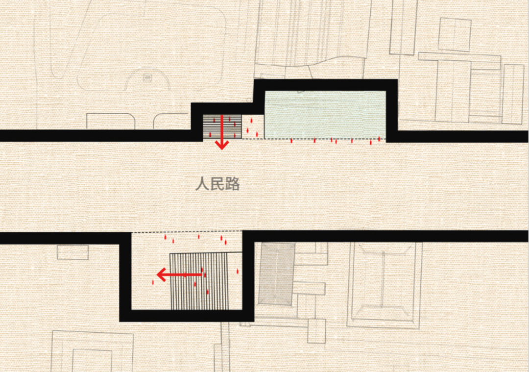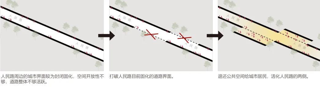 设计之初,我们就考虑到了人民路特殊的历史文化价值。在这条文化长廊上,任何的更新改造都需要谨慎。因此,我们反向思考,通过以退为进的设计手法,在打破原有封闭城市界面的同时,退还一部分的公共空间,丰富了街道空间要素,依托原有的文化设施,在提高街道空间利用效率的基础上,提升道路两侧的风貌品质,期冀为城市街道更新设计提供可供借鉴的方式路径。