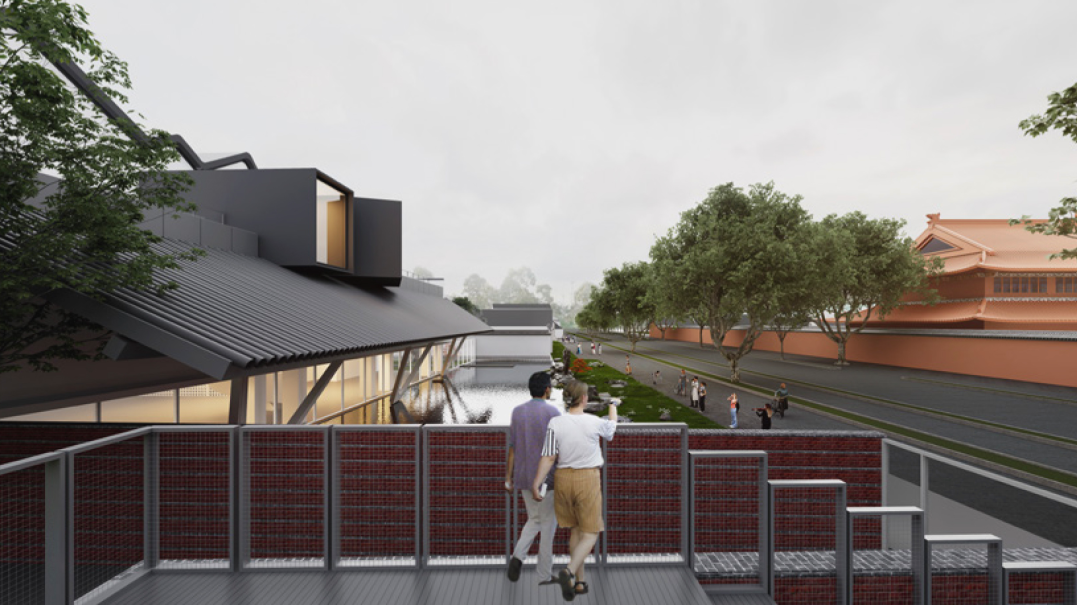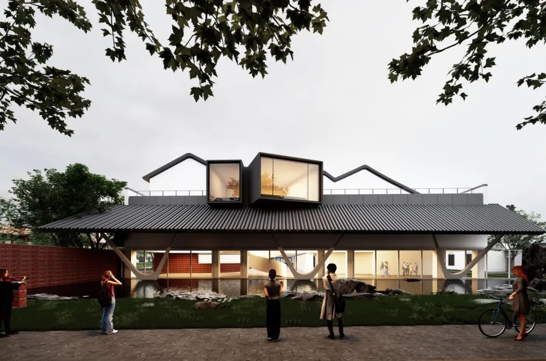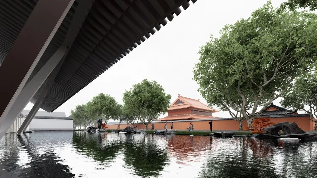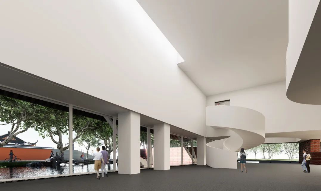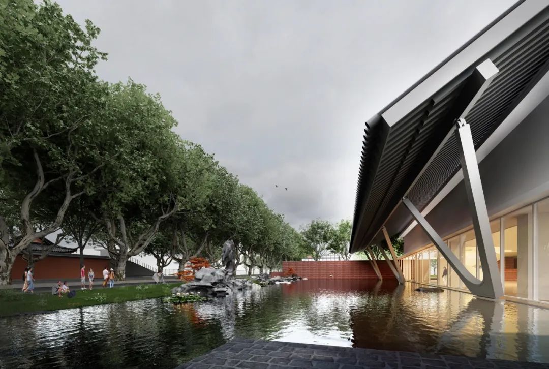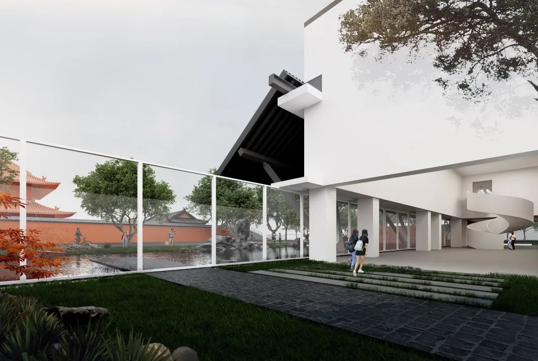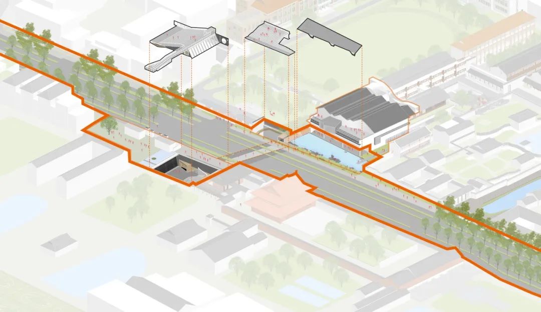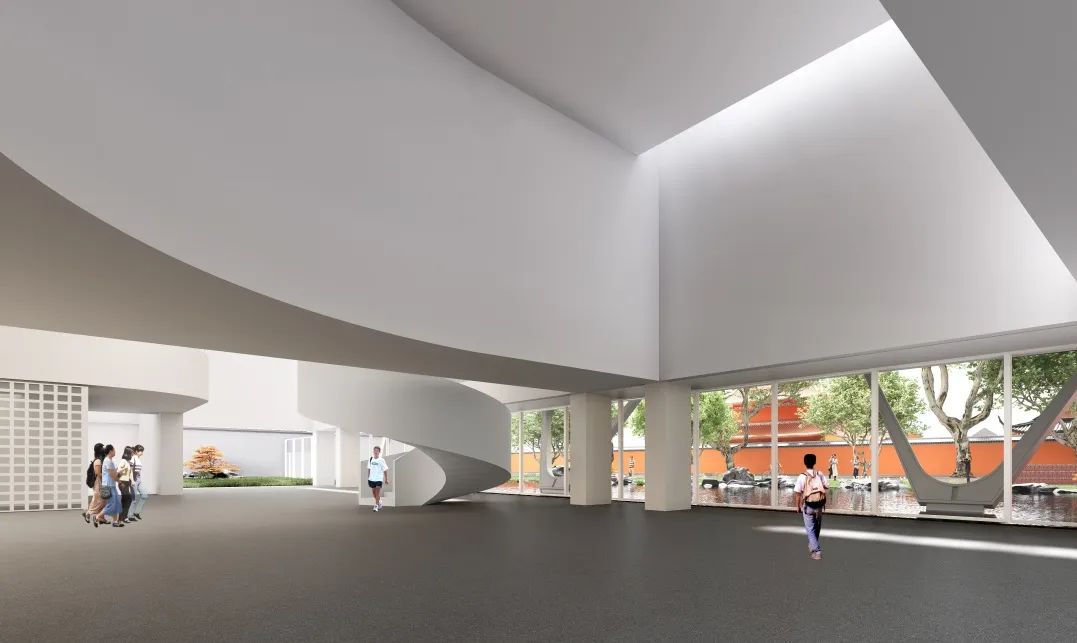 随着城市空间发展和功能加载,人民路两侧部分空间不同程度地存在界面封闭、公共空间活力不足、开放度不高等问题。针对这一现状,我们选取人民路上极具标志性的苏州中学路段作为研究案例,以“古城新脉,以退为进”为设计理念,打破了校园原有的封闭围墙,通过边界空间的退让,设计一个开放的校园新空间。增设活力开放空间要素,植入双子讲堂与水景园林两大元素,形成了面向人民路的开放式广场与园林景致。双子讲堂背靠文庙,将教学活动延伸至人民路两侧。