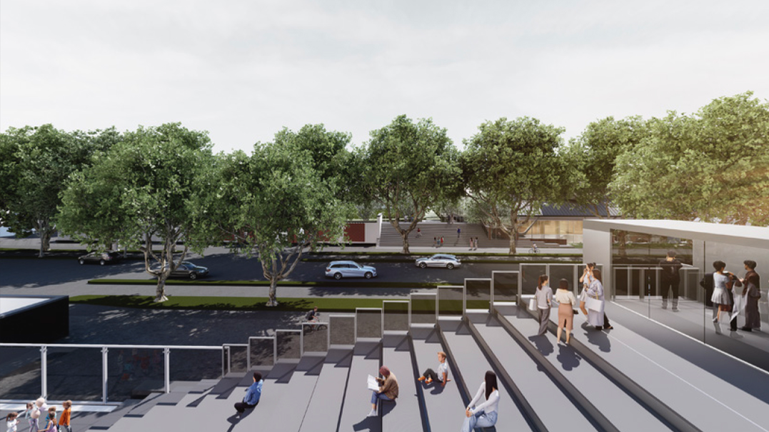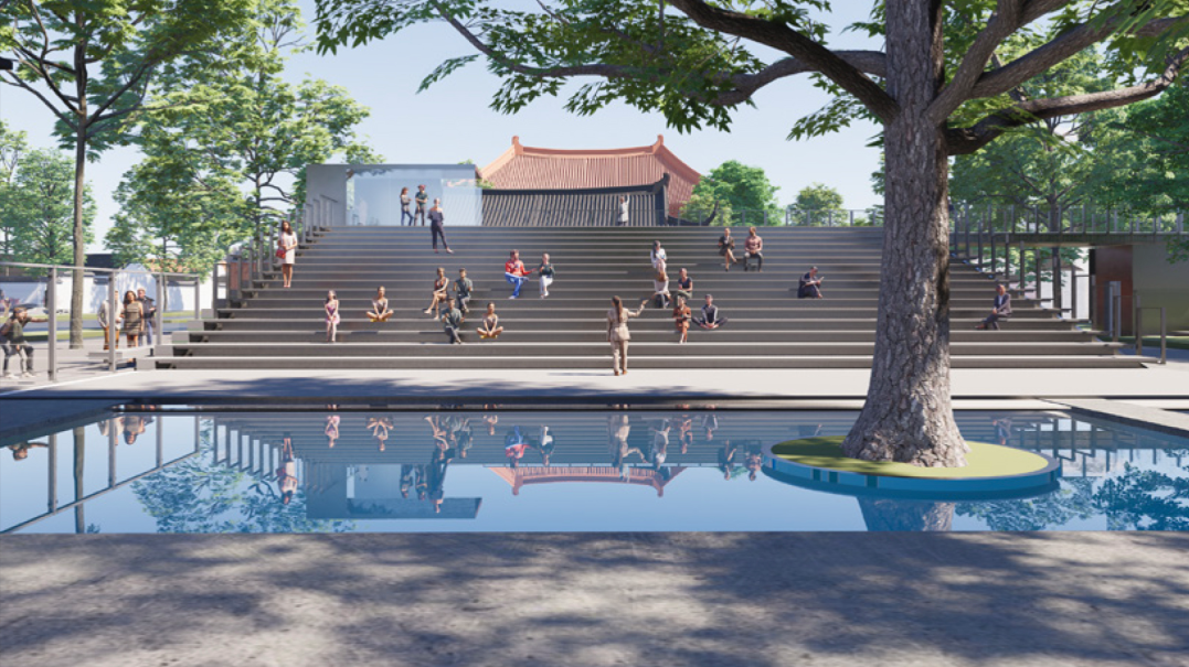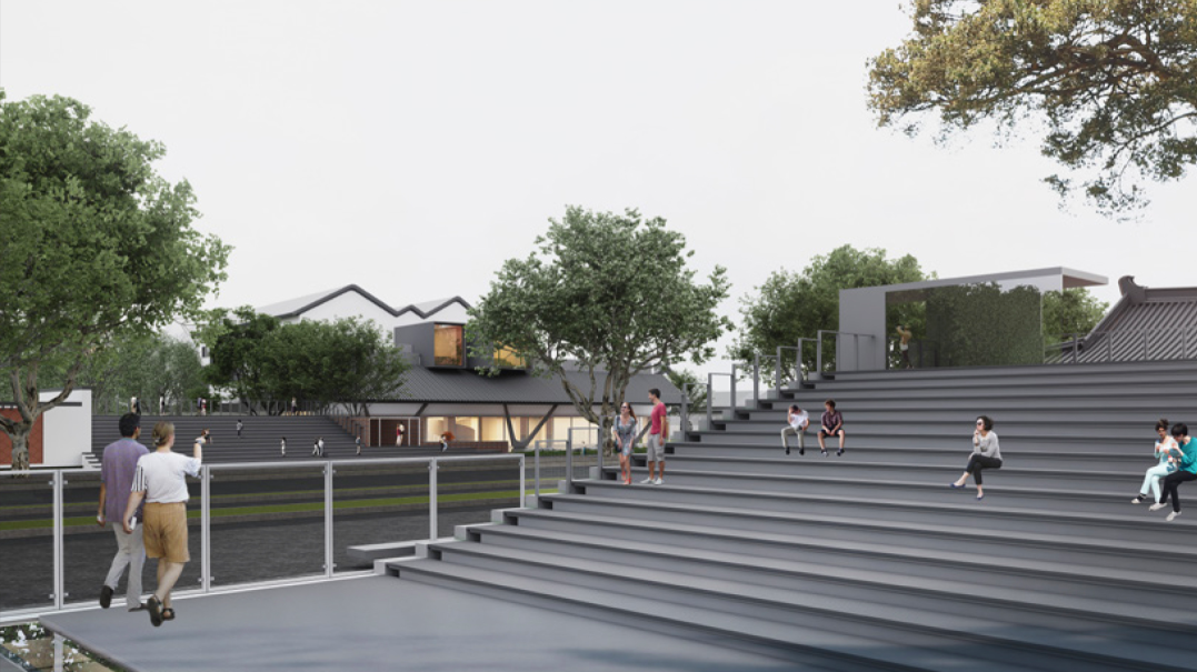 双子讲堂是一处可供人们休憩、可开展学习交流活动、可承载多元业态活动的“小而美、小而灵”场所。它的设计也是我们以退为进设计手法的主要呈现。通过退界的方式,在人民路两侧退让出两块城市空地,并以灵活轻盈的阶梯方式进行空间设计,让空间可承载更多活动的可能。小型的交流活动可以以活泼轻松的方式在阶梯上进行,这也是我们亲切地称其为“小讲堂”的原因。