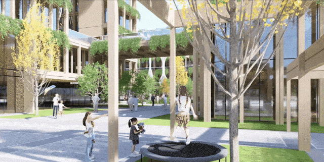 “生命之花”设计是建筑及场地微气候调节装置,通过智能感应系统自动完成光线调节、夜景照明、雨水收集等功能,盛开的花朵造型同时也寓意着生命的健康与绽放。