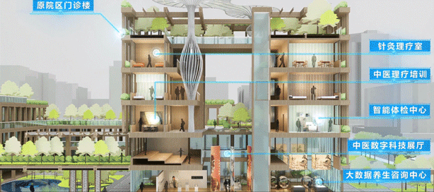 原院区门诊楼转化为中医健康馆,首层的中医数字科技展厅以全息多媒体形式向大众科普国学精粹,大数据养生咨询中心结合人工智能提供精确的科学养生指导。位于场地后侧的原住院楼,植入中医特色的老年康复板块,为老龄人群定制专业系统的养生锻炼及康复指导。