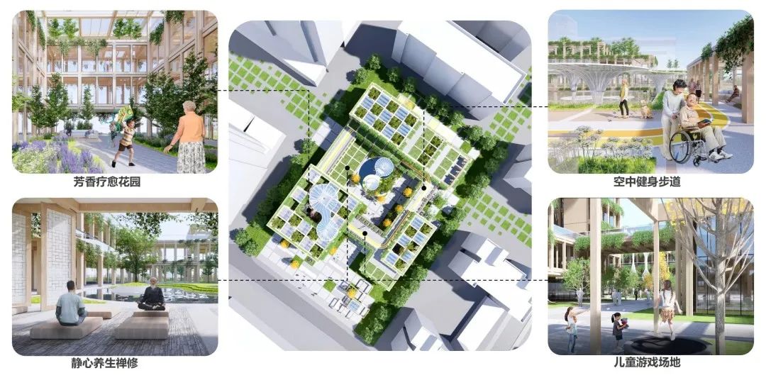 针对医院周边老龄化问题,打造多元活力的适老业态。如拆除部分区域置换为膳食健康体验中心,在智能种植系统的辅助下,退休老人可在屋顶垂直农场参与轻劳动。