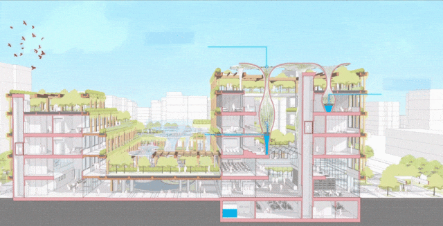 在建筑屋顶,我们采用了光伏发电玻璃,可以调节屋顶农场的光照强度,为智能种植系统提供电力。模块化的网架单元,冬日里可以进行局部封闭,形成温暖舒适的玻璃暖房。中庭空间中生命之花的特色造型,是建筑的微气候调节装置,可以自动调节光线、温度,并起到夜景照明及雨水收集的作用。收集储蓄的雨水被用于整个立体种植系统的灌溉,可形成自我循环的生态环境系统。