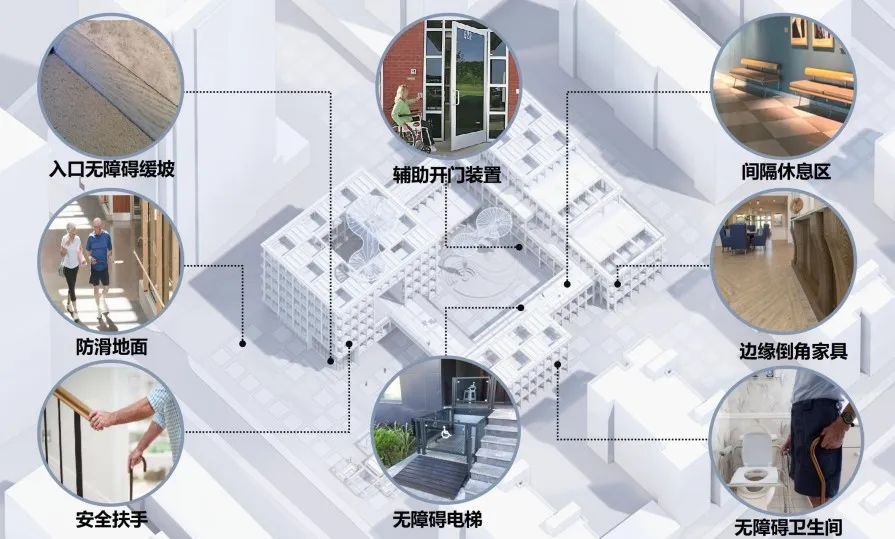 在密集住宅区内对原有中医院做城市更新,满足了老龄人群的多元化需求,是否了考虑不同年龄段的空间适配性设计?以及周边老年人进入场地的无障碍路径、安全性设计?