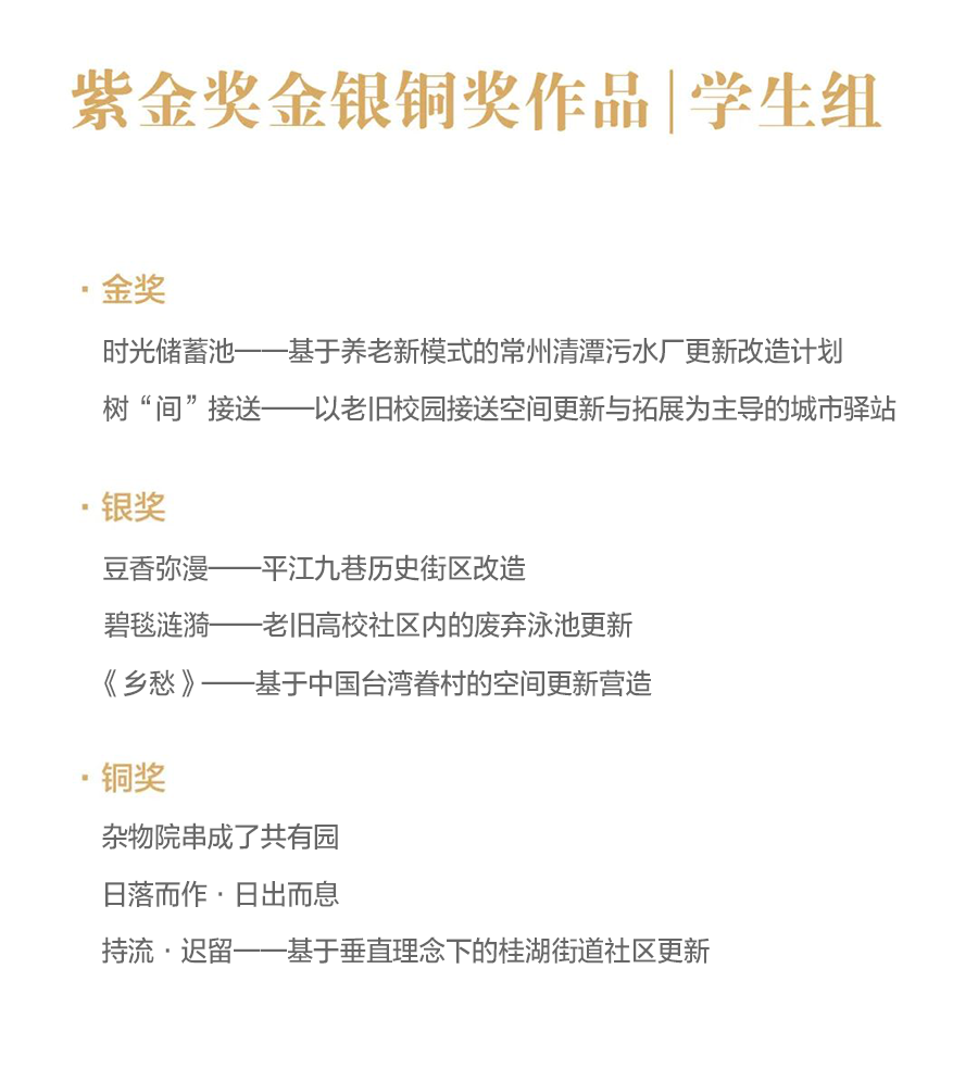 参赛作品紧扣“更新”主题,创作了一批题材广泛、类型多元、亮点纷呈、富有创意的设计方案。近期微信公众号将逐步推出第十届紫金奖建筑赛获奖作品解读,期待能为城乡建设高质量发展和美丽宜居城市建设提供思考启迪。