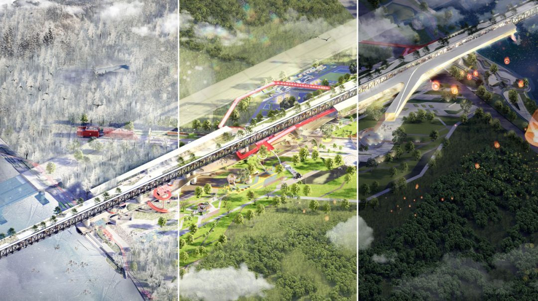 在场所更新方面,改变桥梁的传统交通功能,融入展览、休憩、社交等功能,使其成为市民可停留、可互动的活力场所,串联松花江两岸的城市生活。