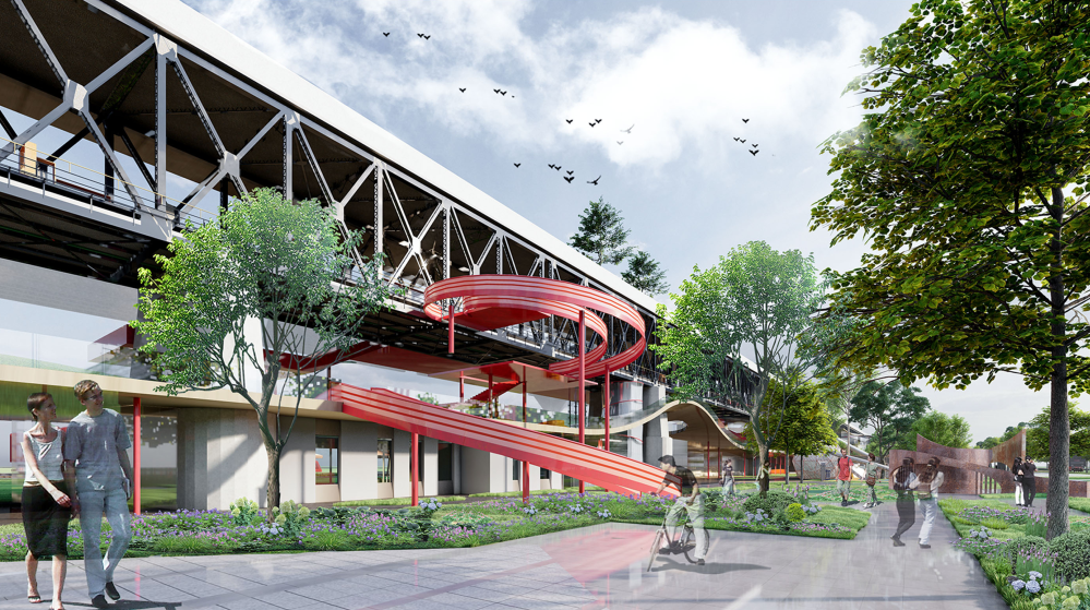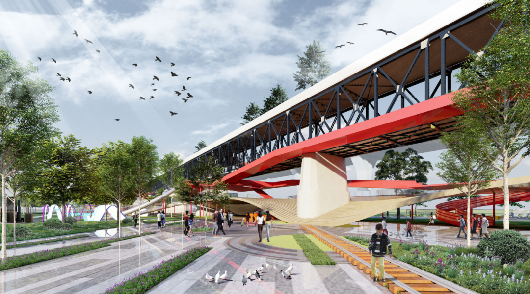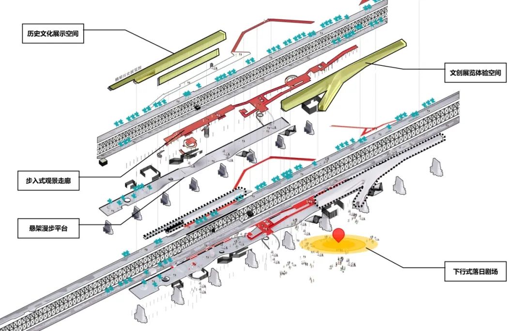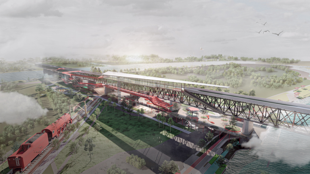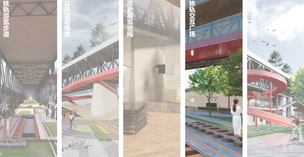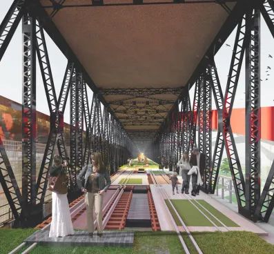 首先,我们设置了铁轨游览步道、公共活动场地、展览空间、铁轨交互广场、儿童友好场所等配套设施,以满足市民休闲、娱乐、社交等需求。其次,我们用步道串联整个桥体的各个空间。步道设置多个功能节点,沿线配备夜间照明系统和各项智能导览系统,以提高场地的通达性。