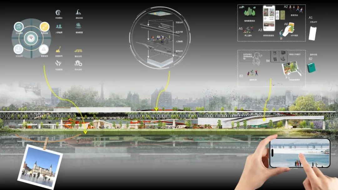 在生态塑造方面,引入城市森林理念,在桥梁上局部覆盖本土植被,优化生物栖息环境,同时结合雨水收集系统与光伏发电等技术,使其成为人与自然共生的生态纽带。