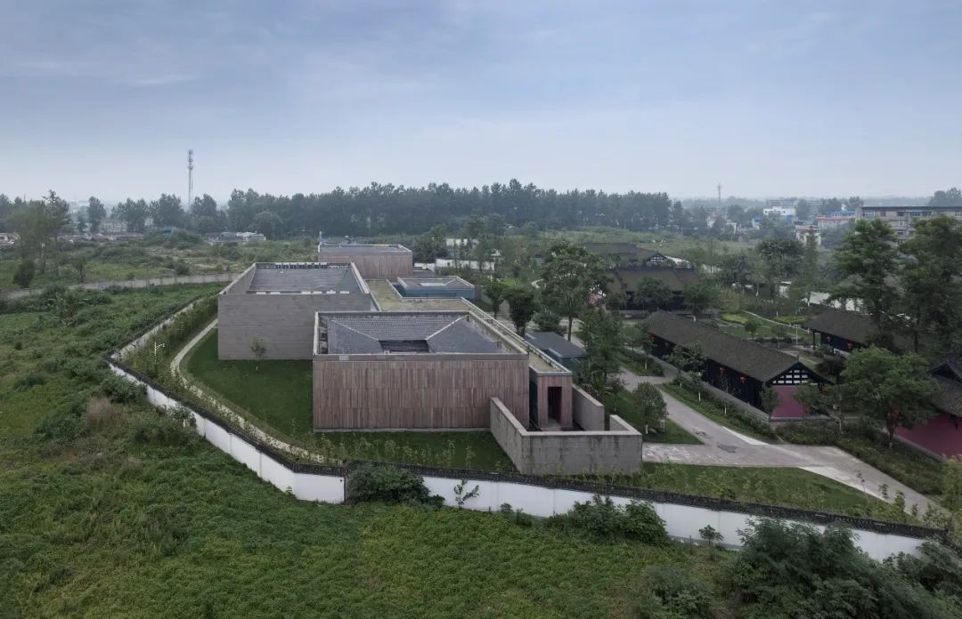 绵竹历史博物馆的空间以川西民居自由灵活的布局形态为缘,提取川西传统合院式民居形象抽象为内向四坡屋面空间,以三处“凹”字形合院作为空间联系,以连续的、自由的水景消解空间的隔离。其石材取自本土,凿刻的灵感来自农家的石磨,以地域材料及技艺唤醒某种沉睡的场所意识。