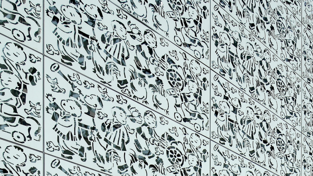 绵竹体育中心的主体育场屋面拟合“舞动的飘带”,以流动曲线的建构“漂浮”于主看台之上。木板年画是绵竹远近闻名的地域特色,设计以传统“画壁”的角度思考木板年画与体育中心之间的联系。项目结合“飘带”设置双层表皮:外层以镂刻年画图案的金属网膜拟合年画剪纸的形象,内层则以玻璃板提供围护与采光。木板年画的主题选择“希望与丰收”,通过建筑意喻某种朴素的未来期许。