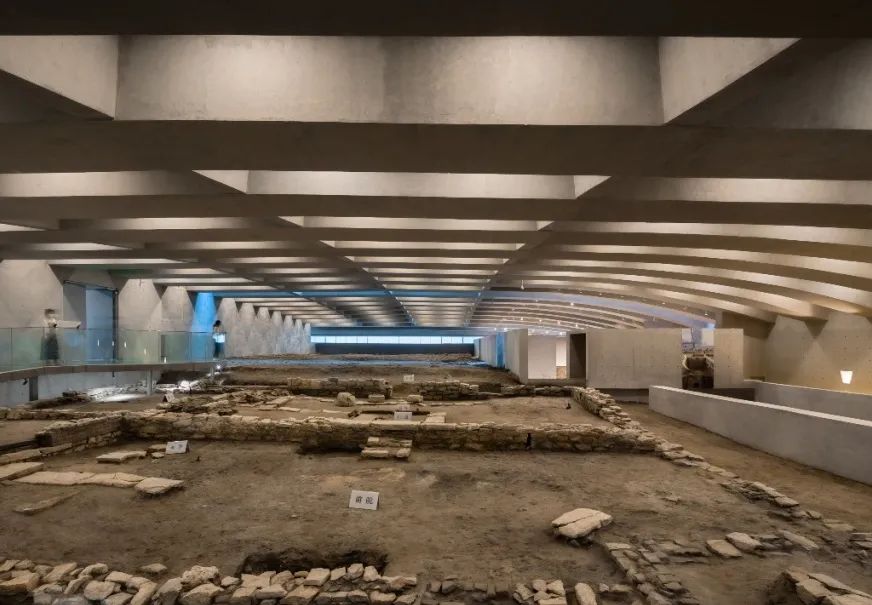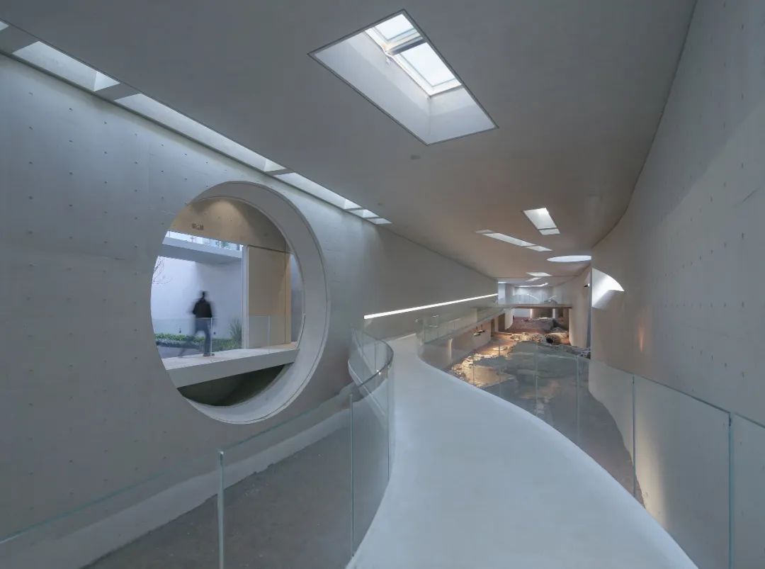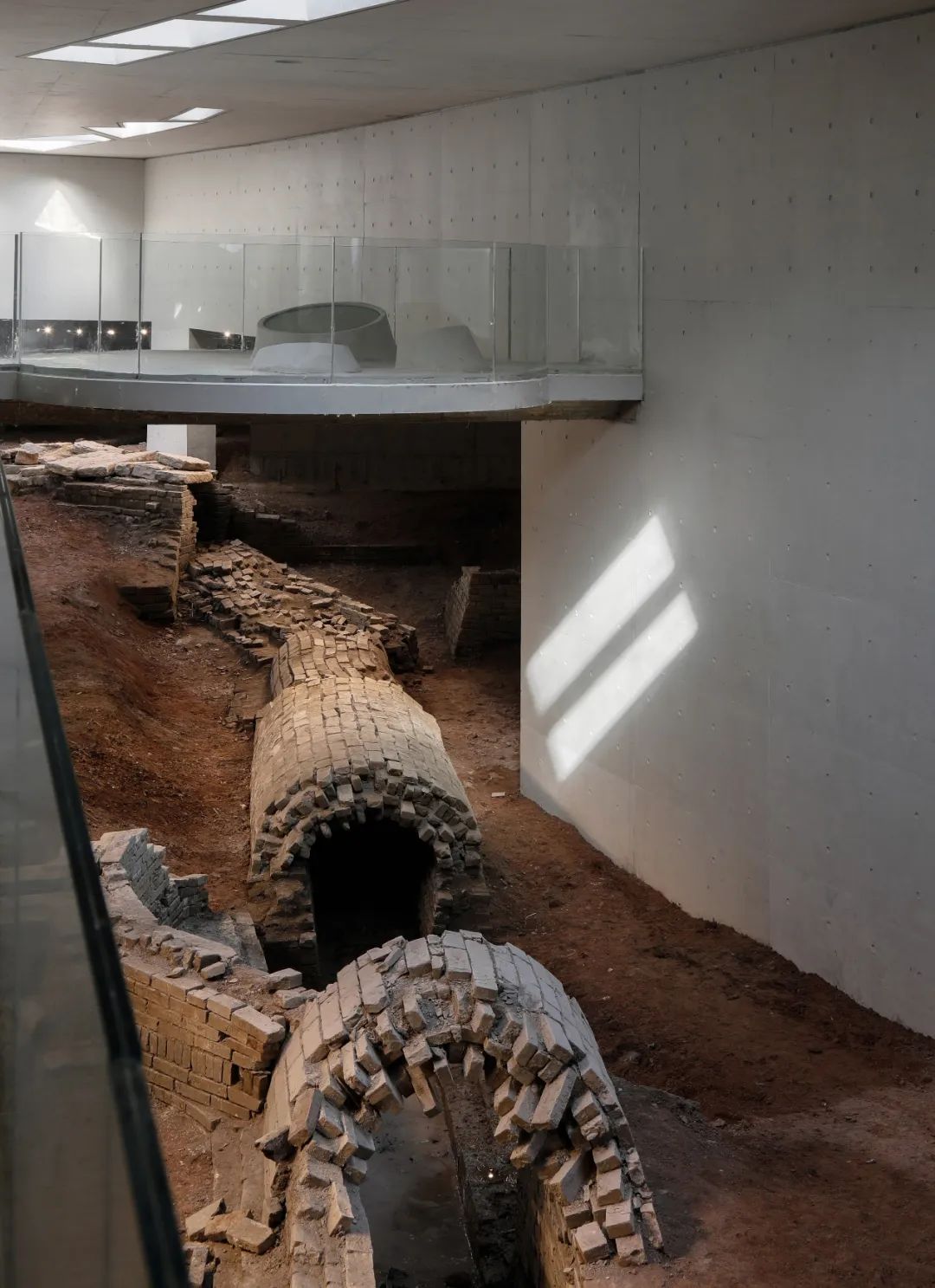 宿迁古渠遗址博物馆立身于新盛街历史街区与城市新建筑的交结点。东侧的室内以一曲“桥”悬于遗址之上,引导参观者清楚看到古渠的脉络;清水混凝土的遗址空间提供了纯粹的当代语汇,与青砖筒拱的古代水渠遗址形成时间的关照;追随场地的高差,屋面在北端与地面相接,建筑成为地面的延伸,是对场地与多时间线索的谦逊回应。西侧的当代展厅,以连续的清水混凝土半拱的形式几何转译古渠筒拱形制,并以严格与精致的数学几何定义了博物馆的当代美学价值。这座立足于历史遗存上的当代活力新空间,除了用以记载时间的连续性,还为当代的城市活力和秩序提供了解决方案。