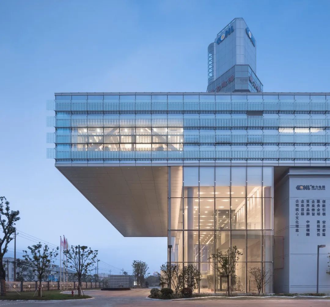 康力总部研发中心以旧建筑保留与改扩建的方式重新解读现代语境的建筑延续。新的体量自旧建筑北侧开始跨越旧建筑及主入口厅堂,南向悬挑近二十米,采用十六米高抓点玻璃幕墙及双层幕墙系统,属于现代语境的建构。新与旧在建筑语言上分别对应不同的时代,通过设计语言建立某种有机的联结,象征着一家企业的初心与荣耀。