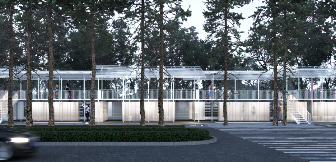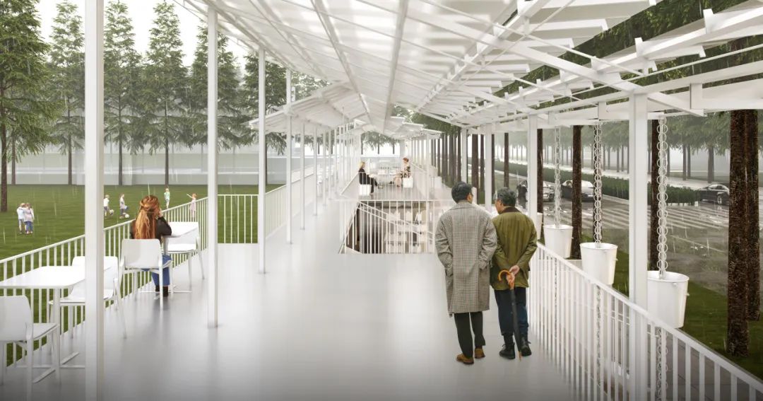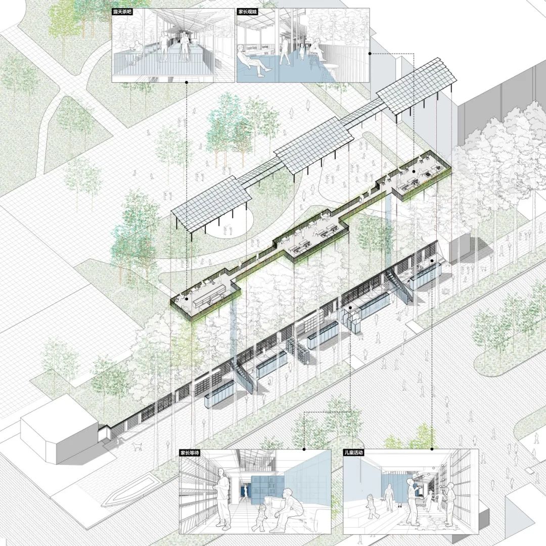 该方案以东南大学校西区、东南大学附属幼儿园东侧临街围墙作为设计切入点,将原本3米的人行道扩大为6米,分别划分为宽度各为3米的两个空间,靠城市道路外侧的3米空间继续保留为城市日常的慢行通道,而将靠幼儿园内侧的3米空间通过对墙体进行三叠四折的形体处理,不仅在平面上生成了多变的静态空间与动态空间,还在立面上创造了可以休闲与瞭望的二层平台。这些空间既为街道慢行系统提供了更为丰富、可停留活动的场地,也为家长们提供了友好的等待与交流场所。透明的风动屋顶与墙面百叶亦充满灵动与趣味。