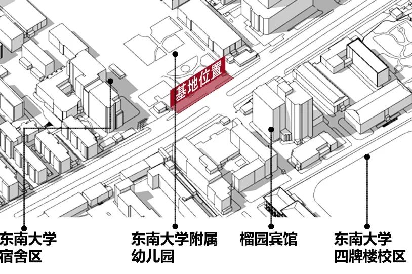 项目选址位于东南大学校西区,东大校园与东大幼儿园之间。道路两侧界面封闭沉闷,内部环境逼仄,步行空间拥挤,是城市中典型的老旧街道。