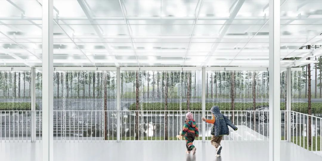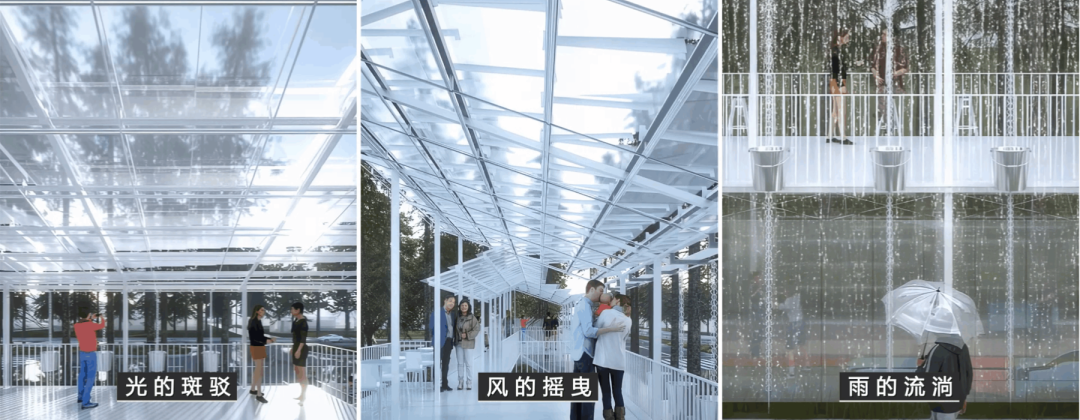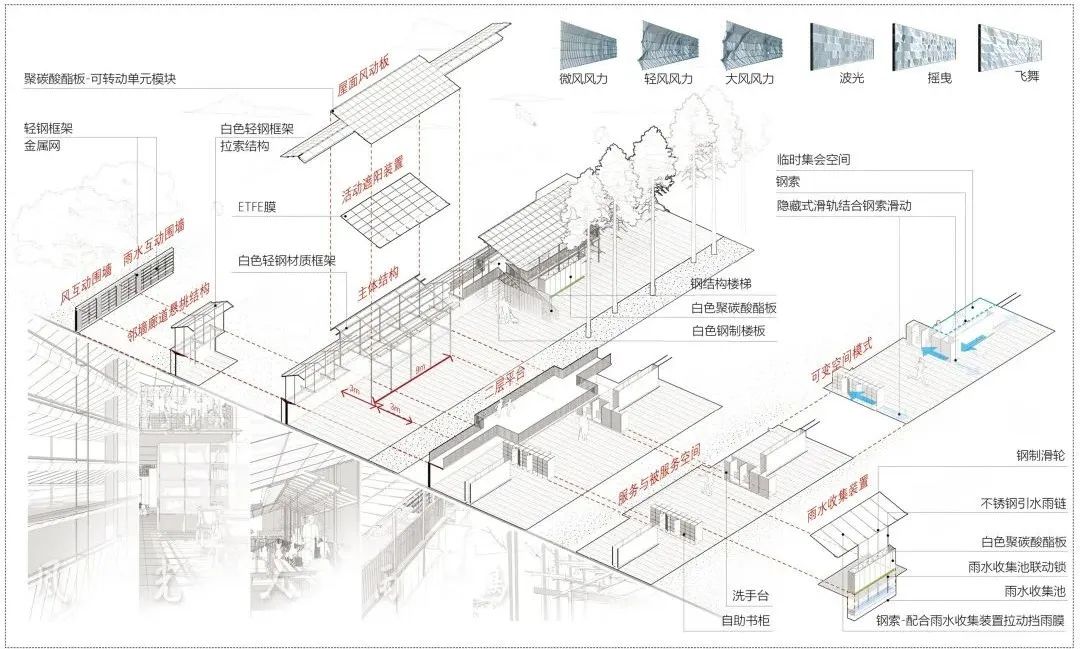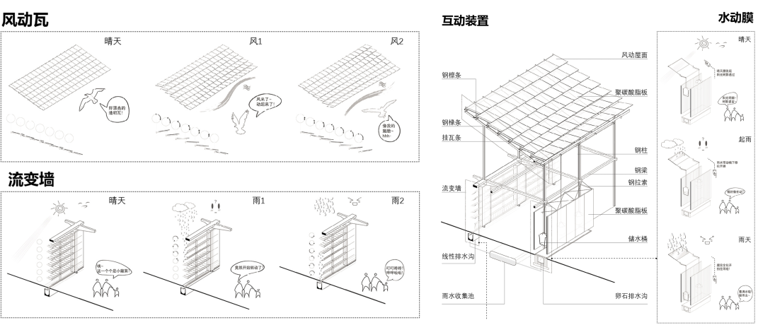我们以模块化、轻介入为理念,将自然元素与建筑设计相结合:例如利用雨水重力控制开合的水动膜、利用风力控制飘动的流变墙等,让风、光、雨结合动力学装置在这里也成为设计的一部分。我们希望上述构造能够使周边儿童通过听觉、视觉、触觉等方式,感受到自然界中的风、光、雨,这也将使方案更具诗意、更为有趣。