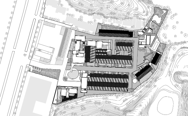 内部广场位于办公区域深处,由沿山建筑和院落状厂房限定而成,是林荫道轴线的终点和环线的转折点。广场静谧自然,阶梯式景观顺应山势和建筑变化,并隐藏功能所需设施。