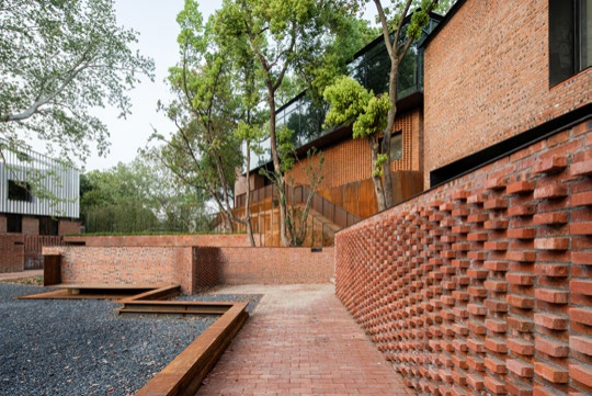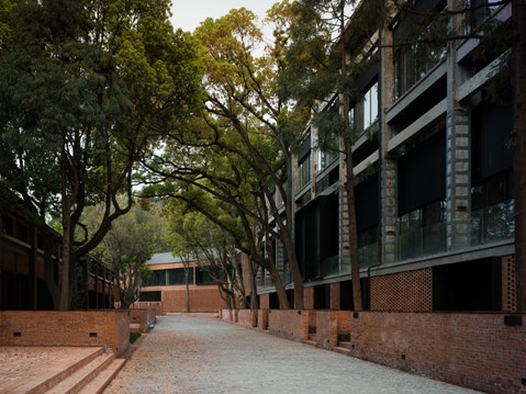 林荫道是老厂区最令人印象深刻的部分。我们保留了两侧的香樟大树,作为与红山森林相呼应的景观要素。环路两侧的景观空间通过低矮院墙和植被,将建筑与自然融合,消弭场地高差,给予每栋建筑独有的半私密空间。