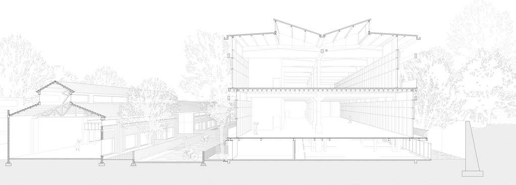 结合原有建筑图纸和结构鉴定资料,我们对保存质量不一的园区建筑采取加固、置换、新建等设计方式。模具车间是体量最大的建筑,始建于1970年代,为钢筋混凝土排架结构。为满足使用功能和结构加固需求,我们将首层空间分为两层,增设钢结构,形成“箱体”结构,增强抗震性能。顶层植入倒八字形钢结构天窗,解决采光问题,让天光与绿意交相辉映。