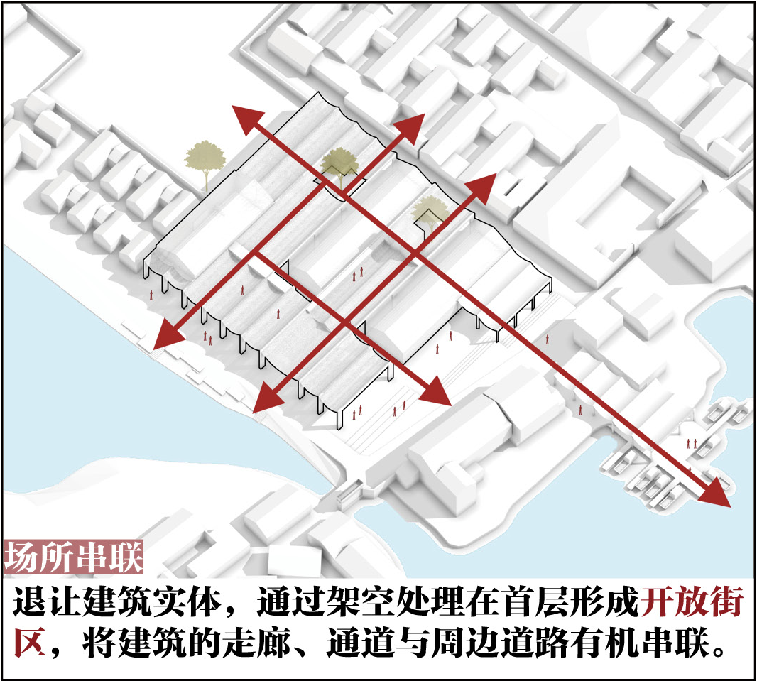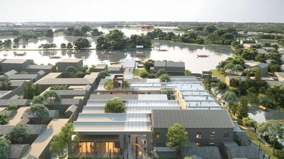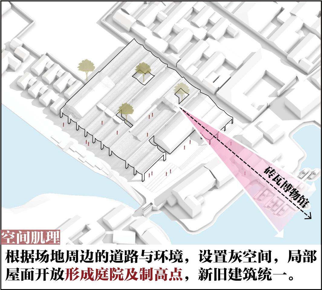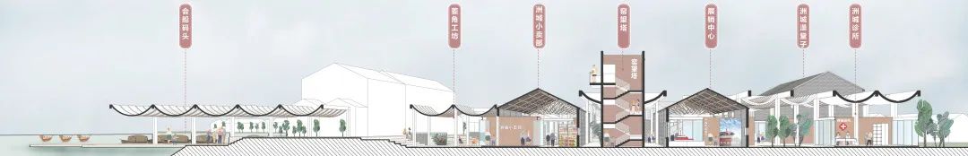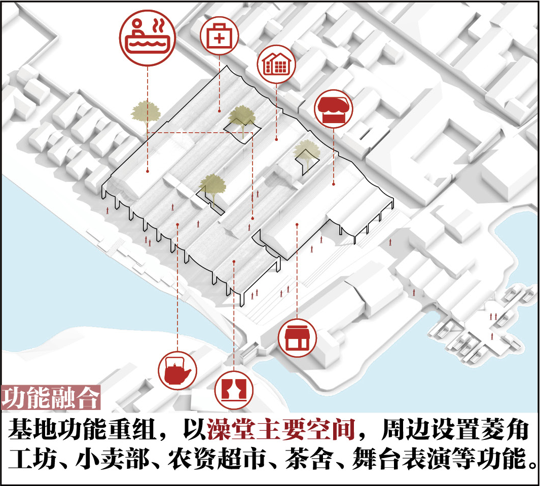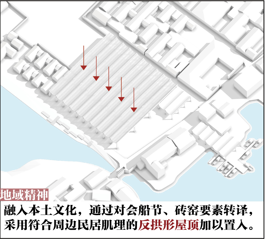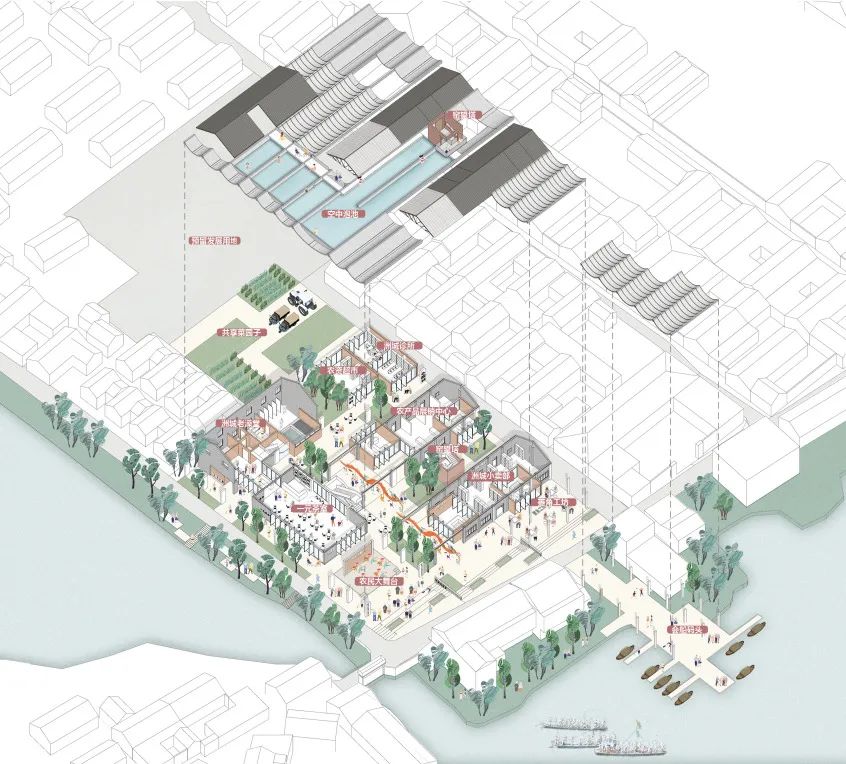 首先对现状建筑进行局部拆改,打通新老村落间的公共通廊,结合村民日常生活使用需求和景观资源,优化功能布局,容纳澡堂、茶室、戏台、小卖部、农产品展销、诊所等功能。同时从地方砖窑、会船文化中提取拱形作为屋面元素,形成单元模块在建筑之间延展,再设天井、采光顶及空中泡池,并增加“窑”望塔,打通面向砖瓦博物馆的视廊。