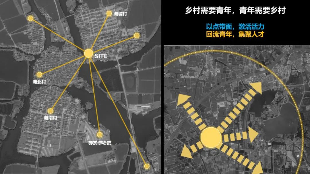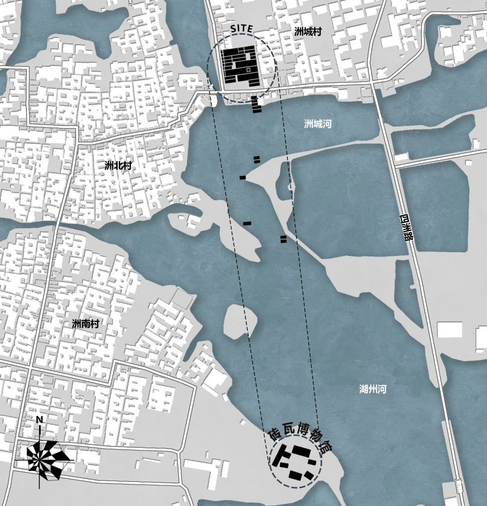水城慢生活,人间幸福多。泰州乡村多位于里下河地区,乡村河网密布,传统民居多以青砖灰瓦为主,具有独特的地理人文环境。洲城村是泰州专项赛道的设计基地之一。我们选择该村老供销社及其邻近空间作为设计对象,以期通过更新和改造,力图在尊重乡村历史记忆和风貌特色的基础上,以新的空间形式、结构探索在当代语境中如何营造恰当舒适的公共空间。
