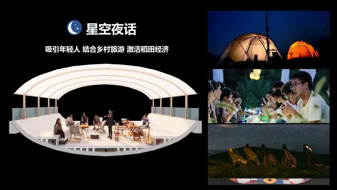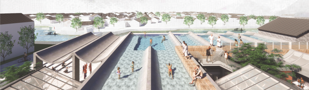 除此之外,屋顶空间还提供了多样的乡村生活场景。拱形屋面排空池水,可打造为儿童空中游乐场;轻质膜结构的搭建,可营造青年夜观星空、夜聊未来的开放场景;安装临时架空地板,可为村民提供平整的屋顶活动场地,远眺溱湖美景、享受日常生活的乐趣;平缓的弧形屋顶还能作为村民晾晒农作物的理想场所。这一水池屋顶的设计不仅能满足功能需求,更让村民在四季皆可体验到“生活即幸福,日常即诗意”的美好氛围。