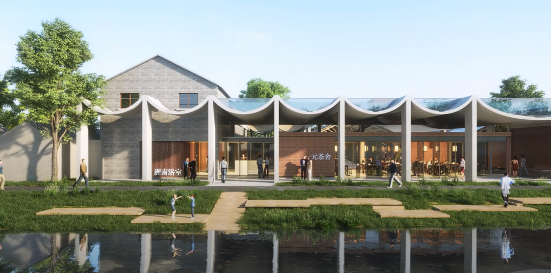 连绵起伏的拱形屋面掩映在村落肌理之中,村民可泡澡、畅聊、听戏、品茶。