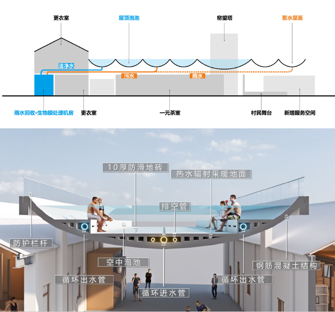 我们以空中泡池为特色亮点,充分结合雨污水回收、生物膜处理等,实现春夏秋冬四季都可为村民和游客提供室外游泳及泡澡服务。