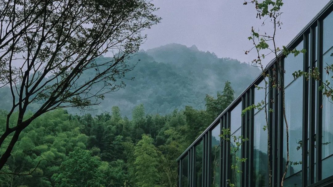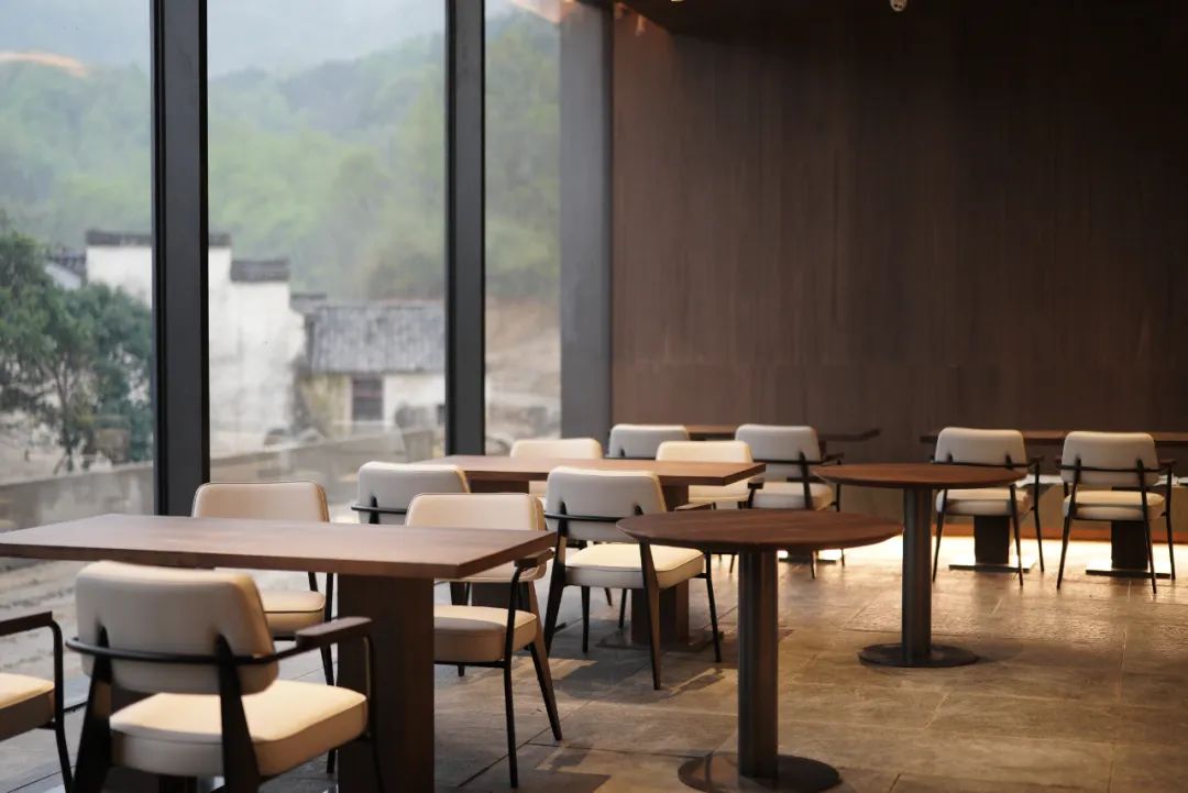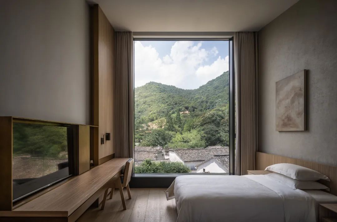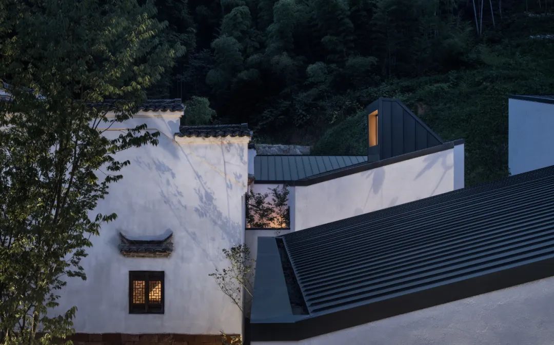 在材料选用方面,设计团队采用白色质感涂料和木材等质朴的材料来消减新旧建筑的冲突;采用深灰色金属、白色仿石挂板等现代材料来再造当地风貌。主楼二层采用了大面积落地玻璃:在室内,营造了开阔通透的景观视野;在室外,玻璃映射的婆娑树影让建筑成功消隐在环境之中。整个酒店组团在传承当地传统建筑神韵的同时,让新建筑、村落和自然环境完美相融,恰如其分的营造了村落之中的“静”,山谷之中的“隐”。