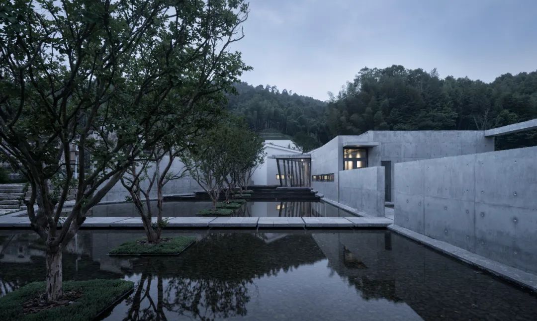 会议中心坐落于村落入口附近。村落原有的街巷自然形成了建筑的引导空间。一栋保留修缮后的古建筑被巧妙地改造为会议中心的主入口门厅。新建部分从这座保留建筑向远处的景观延伸、舒展。建筑主体坐落于梯田式的水景正中,平静的水面成为了倒映建筑和山林的媒介。清水混凝土的墙面呼应了村落环境的古朴面貌。