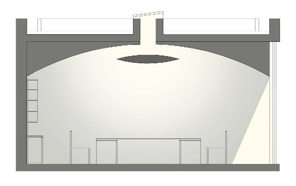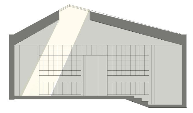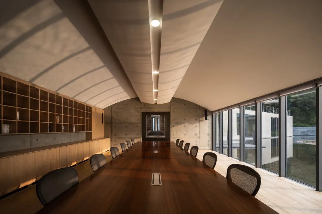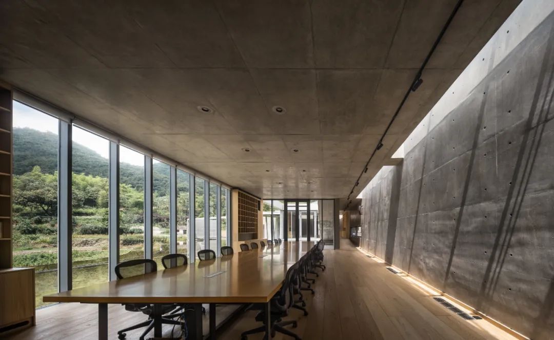 会议中心三角形大厅作为建筑的核心,以简约的几何形态联系入口和两翼的会议室和休息空间。几处天窗的设计取自村落建筑和街巷中的场景意象。所有主要功能空间都面朝景观展开,且巧借地形下沉。从室内眺望,可以将村落的田园风光和远处的山林景色尽收眼底。