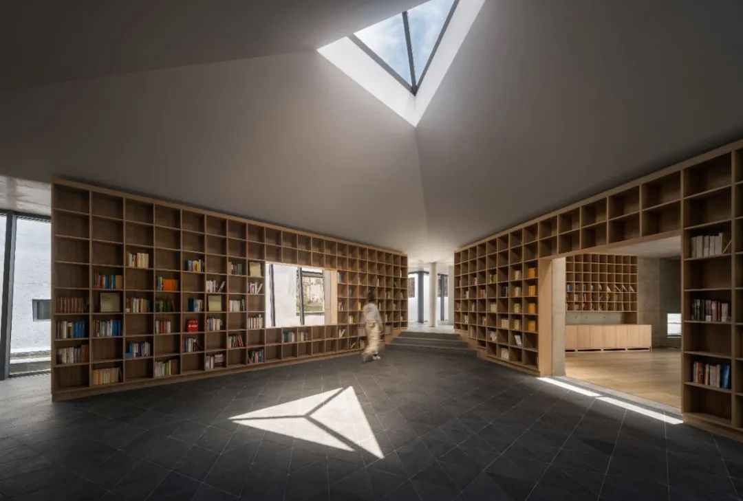 室内以清水混凝土和木色书架呈现出素雅质感。为确保室内和屋顶的纯净效果,设备用房被设置在了地下,所有设备系统均进行了精细化隐藏处理。