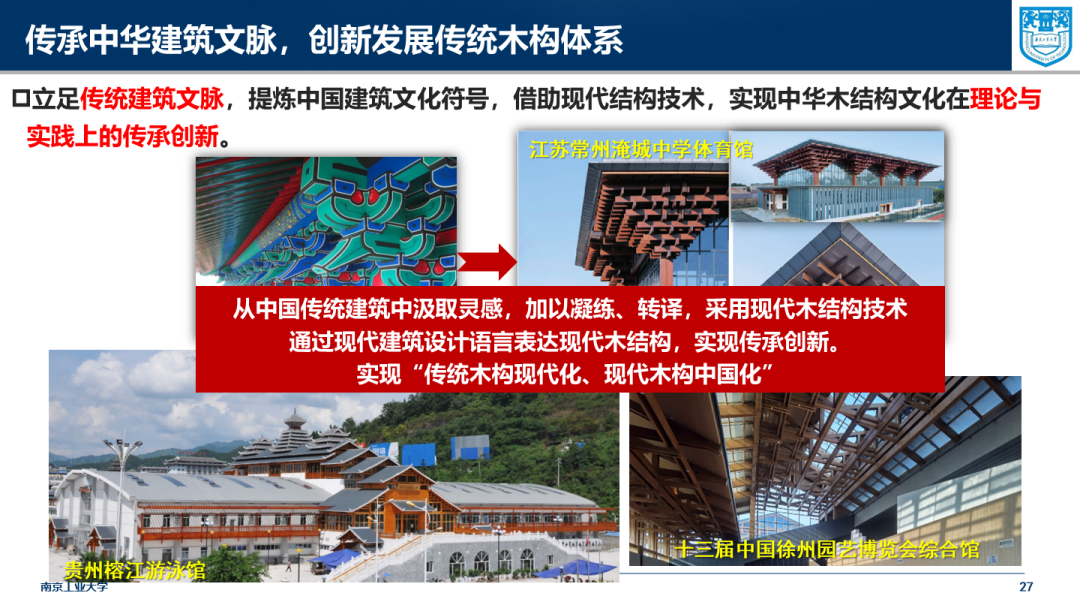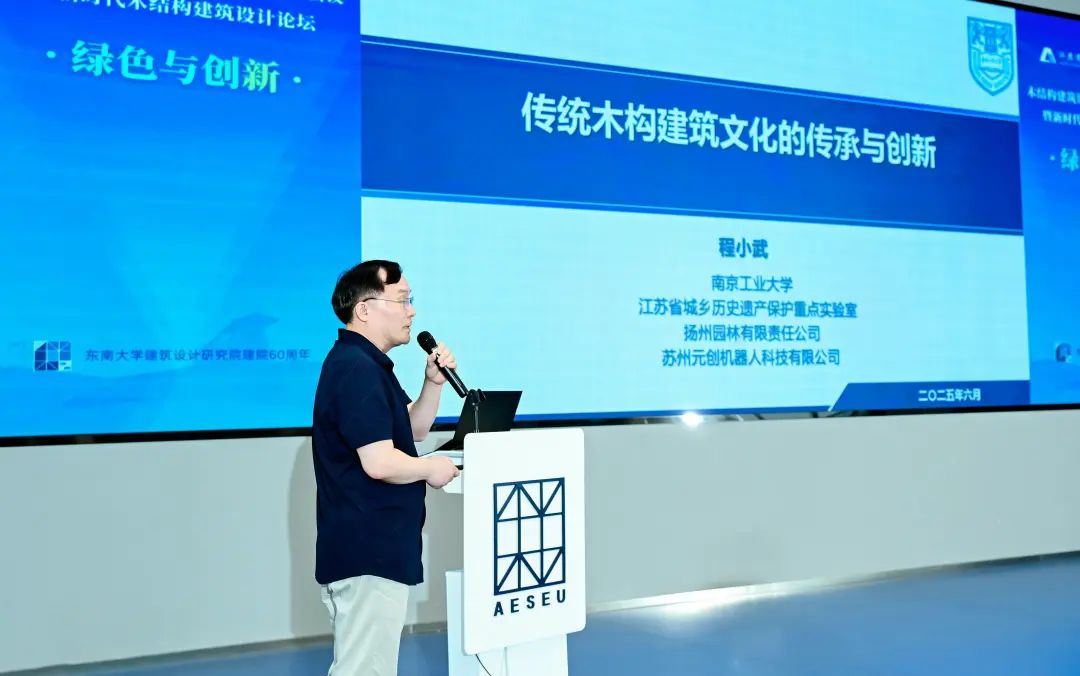 南京工业大学木结构设计院院长、教授程小武作题为《传统木构建筑文化的传承与创新》的报告,报告针对传统木构建筑进行构件、体系和设计方法等研究,实现建筑结构融通、现代结构分析方法与智能化设计加工一体化技术应用等创新。