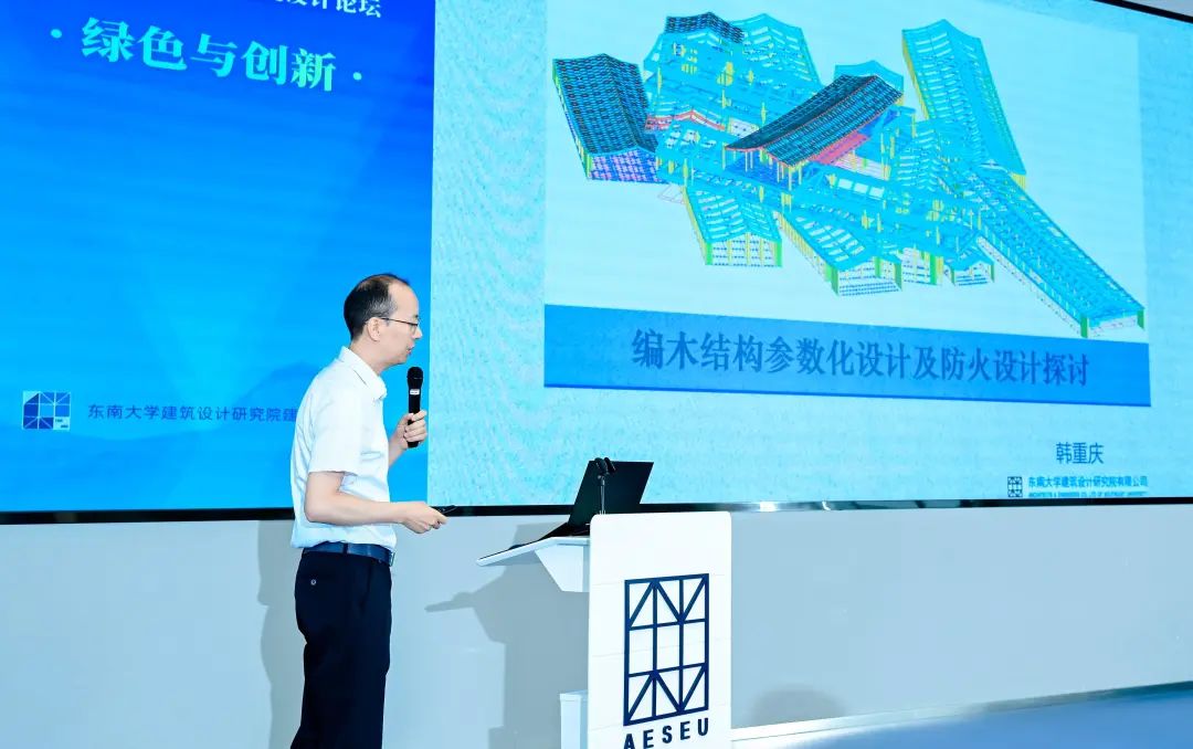 东南大学建筑设计研究院有限公司分院副院长韩重庆作题为《编木结构参数化设计及抗火设计探讨》的报告,报告介绍了通过参数化设计,对变厚度网格、交叉弧形梁等多种形式编木结构进行建模和造型优化的探索以及木结构抗火设计实验探讨。